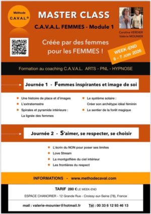 • Ateliers "Découverte de soi" ouverts à tous. Depuis le 4 novembre 2023, Caroline Verdier et Valérie Mounier ont mis en pratique la méthode C.A.V.A.L. dans le cadre d'ateliers pour enfants, adolescents et adultes (alors dénommés  « Masterclass » en Suisse). Au vu des résultats très encourageants, elles décident d'aller plus loin et de s'ouvrir aux professionnels de l'accompagnement qui en font la demande.